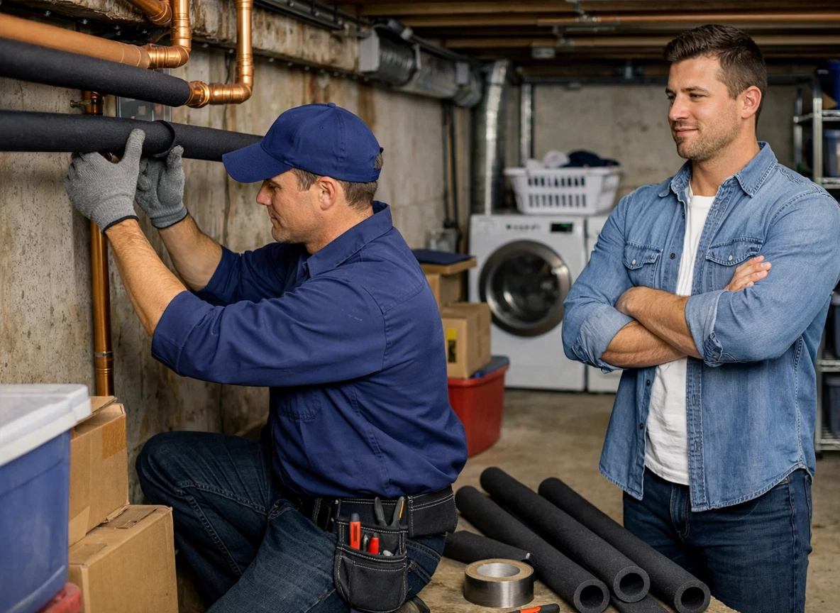 An image of a plumber, insulating copper water pipes in the basement of a home.